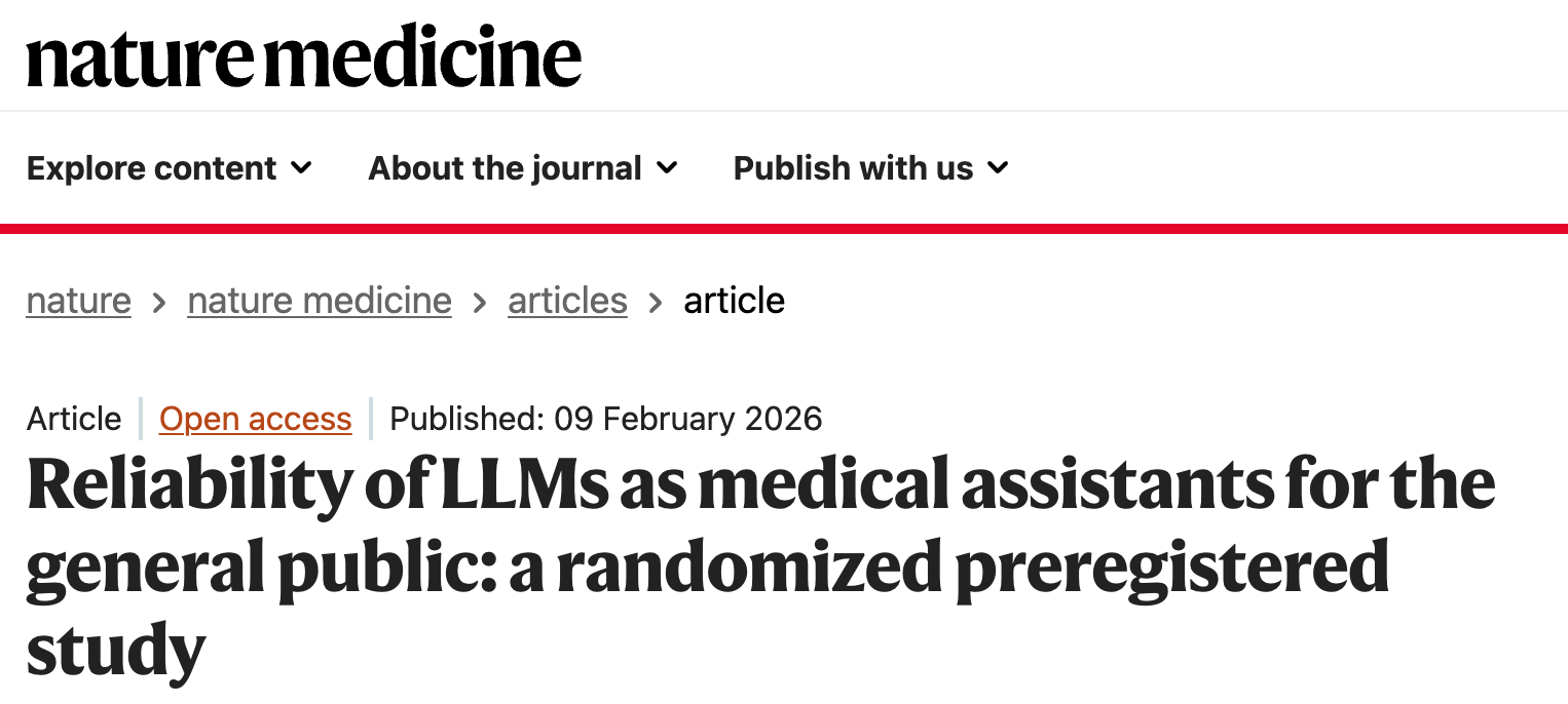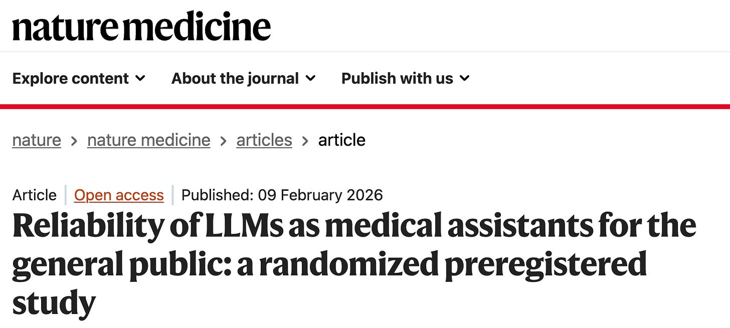 This study has a fatal flaw that Nature Medicine should have caught: it was obsolete before it was published. The models tested — GPT-4o, Llama 3, and Command R+ — are already one to two generations behind. Data collection ran from August to October 2024. The paper wasn’t published until February 2026 — a 10-month peer review cycle for a field where model capabilities change every few weeks (days, hours?). Publishing this in Nature Medicine with the implicit authority of that journal’s brand creates a misleading impression that “AI doesn’t help patients” — when what the data actually show is that those particular models, tested that particular way, 18 months ago, didn’t help patients. The interaction transcripts are genuinely valuable. The finding that humans provide incomplete information to chatbots mirrors what we know about doctor-patient communication. But drawing sweeping deployment conclusions from models that no longer exist is like testing a flip phone and concluding mobile internet won’t work.