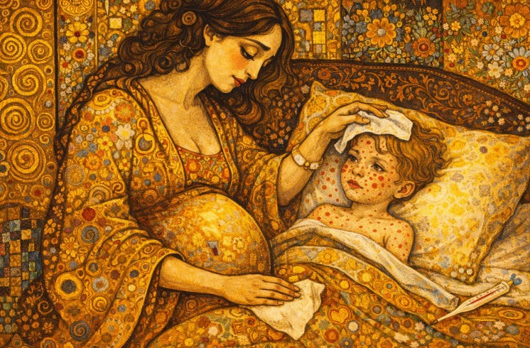 Measles infection near term can result in neonatal measles, with transmission from mother to newborn perinatally. Neonatal measles in the first 10 days of life, before maternal antibody transfer is complete, is associated with higher severity. There is also evidence, confirmed in a landmark 2019 Science paper, that measles infection causes “immune amnesia,” destroying 10% to over 70% of a person’s existing immune memory against other pathogens, with vulnerability persisting for two to three years after recovery. A newborn whose mother had measles near delivery may arrive with a compromised immune foundation.