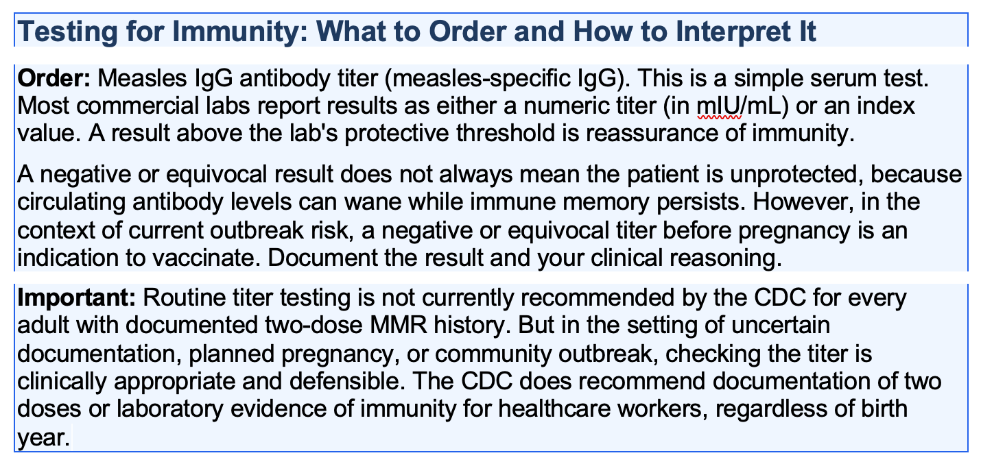 After the MMR series, check a titer to confirm seroconversion before pregnancy is attempted if there is clinical uncertainty. In current outbreak conditions, this is not overcautious. It is standard of care. For patients who discover they are non-immune after conception has already occurred, vaccination must wait until after delivery. These patients should be counseled specifically: their risk from measles exposure during pregnancy is real, and they should avoid known outbreak areas and exposures. They are relying entirely on community immunity for protection during their pregnancy. At this vaccination coverage, that is a fragile guarantee.