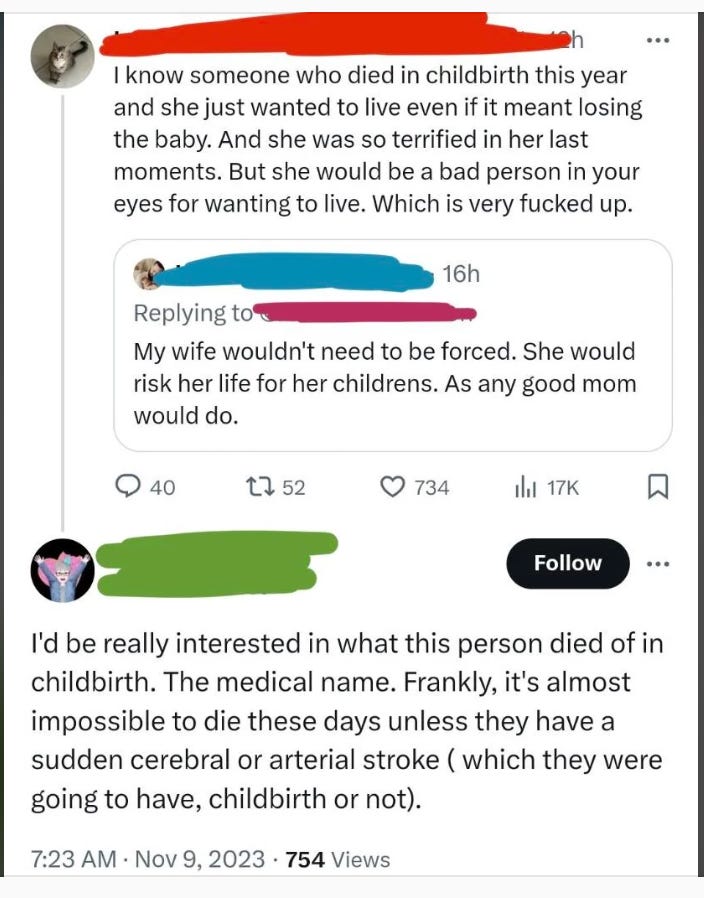 A screenshot shows a social media exchange in which a woman shares the story of someone who died in childbirth and wanted to live even if it meant losing the baby. A male commenter dismisses the danger entirely, claiming it’s “almost impossible to die in childbirth these days” unless from “sudden cerebral or arterial stroke,” and adds that his wife “wouldn’t need to be forced” because she would “risk her life for her childrens. As any good mom would do.”