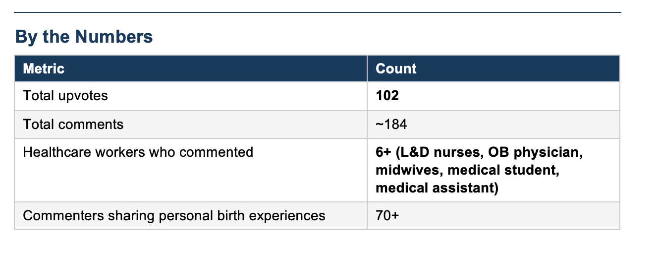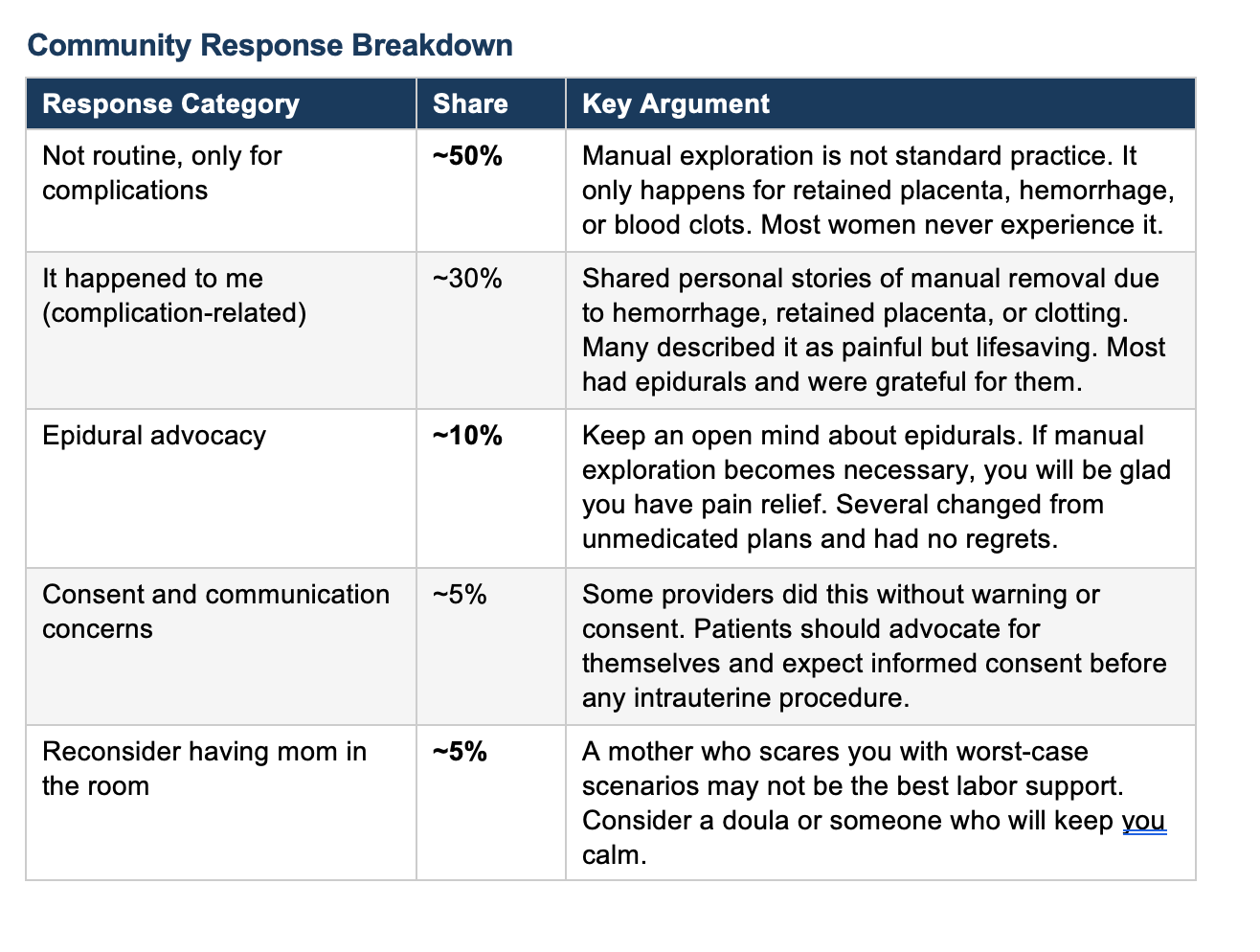 This thread captures a common problem in prenatal preparation: birth stories from family members, often told with the best of intentions, can create disproportionate fear about rare complications. The poster’s mother likely experienced a retained placenta or postpartum hemorrhage and had manual removal performed. That is a real and sometimes frightening experience. But it happens in only 1 to 3 percent of births, and presenting it as a routine part of delivery does a disservice to expectant mothers. What was encouraging in this thread was how quickly healthcare professionals stepped in with accurate information. The OB physician who commented confirmed manual exploration is reserved for hemorrhage and retained tissue, and that IV pain medication is offered if no epidural is in place. Multiple commenters who had experienced it described it as painful but brief, and those with epidurals reported feeling little to nothing.