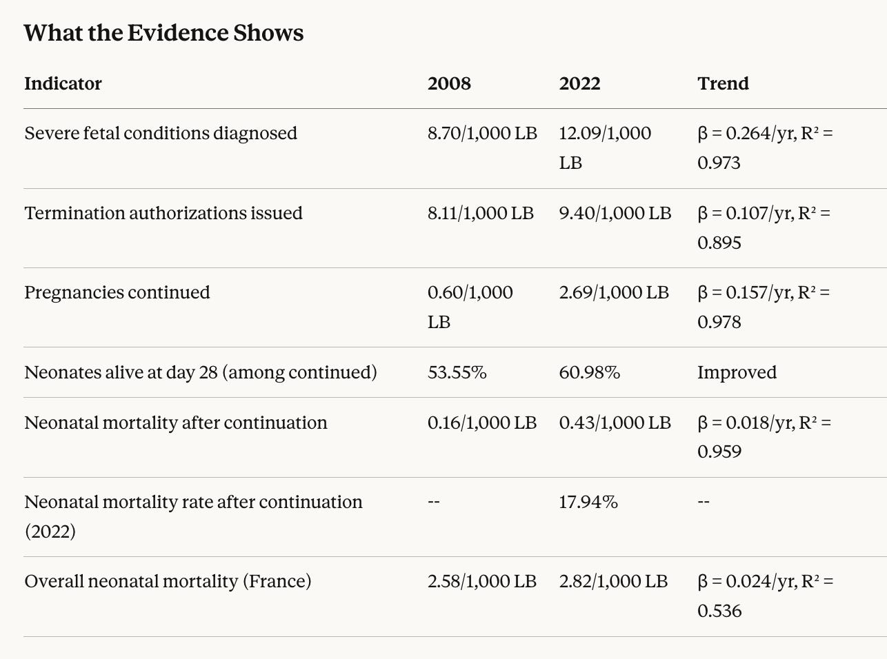 Third, the increase in neonatal deaths after pregnancy continuation did not specifically drive France’s rising overall neonatal mortality. The slopes were not statistically different (p = 0.089). France’s neonatal mortality problem appears rooted in prematurity outcomes, not in continued pregnancies with fetal anomalies.
