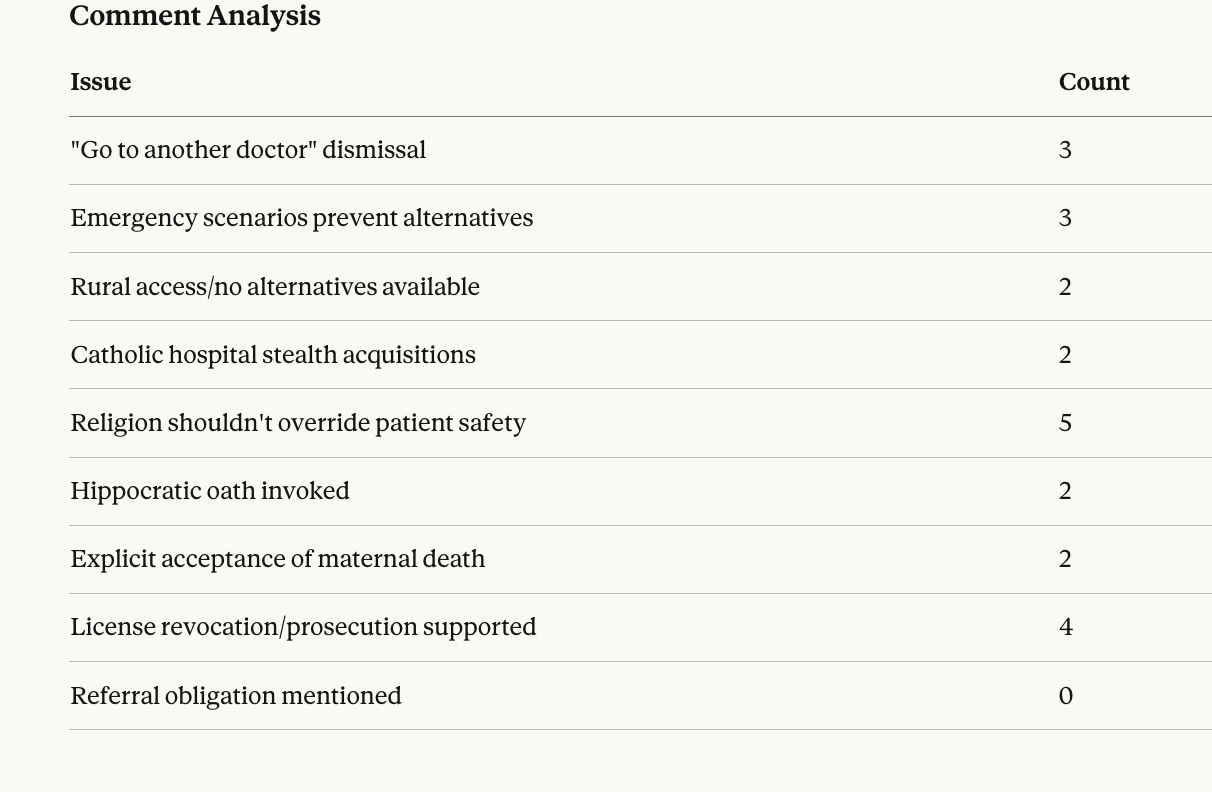 IssueCount”Go to another doctor” dismissal3Emergency scenarios prevent alternatives3Rural access/no alternatives available2Catholic hospital stealth acquisitions2Religion shouldn’t override patient safety5Hippocratic oath invoked2Explicit acceptance of maternal death2License revocation/prosecution supported4Referral obligation mentioned0