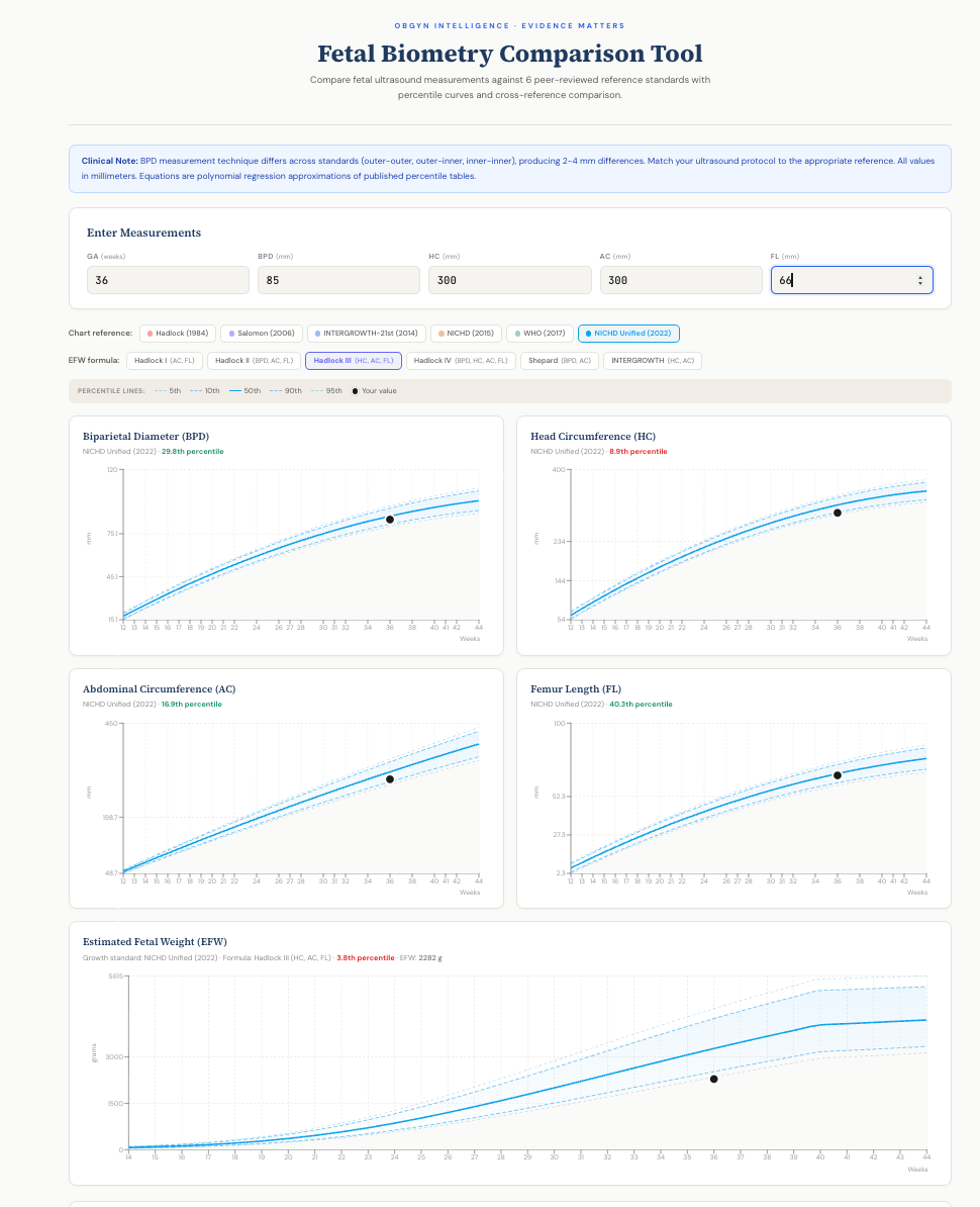 The tool doesn’t diagnose anything. A single ultrasound measurement is a snapshot, not a trajectory. Growth assessment requires serial measurements over time, and clinical context matters enormously. But when your chart says “7th percentile” and your anxiety spikes, it helps to know that the same measurements might read “12th percentile” on a different, equally validated standard.