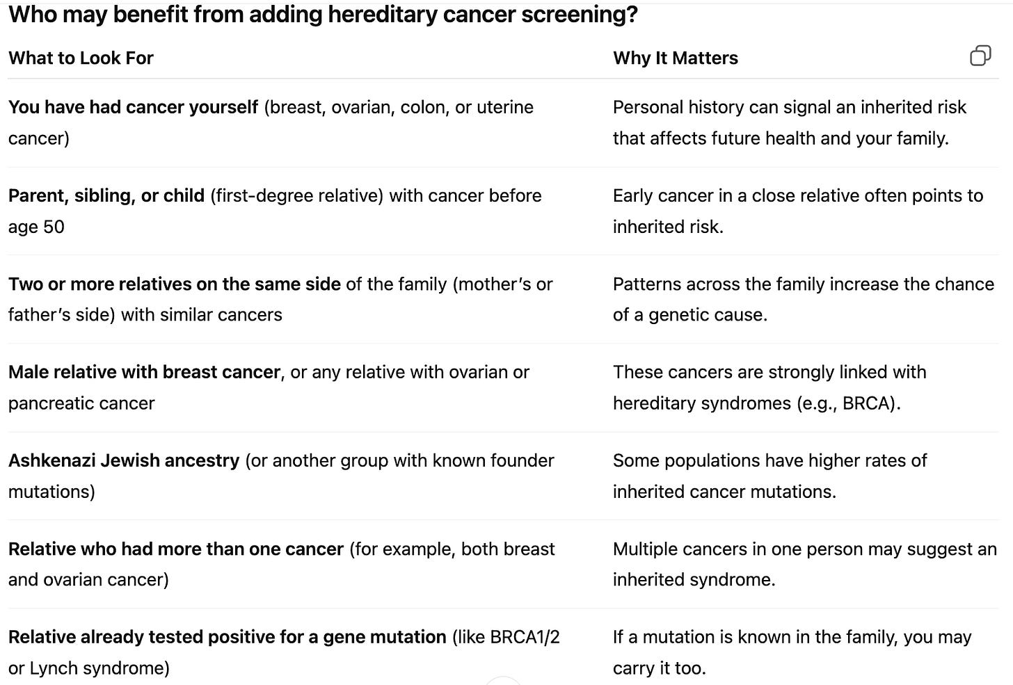 This testing looks for gene mutations like BRCA1/2 (linked to breast and ovarian cancer) or Lynch syndrome (linked to colon and uterine cancer). Identifying these risks early can guide not just pregnancy decisions, but also future screening and prevention for the patient herself and her family.