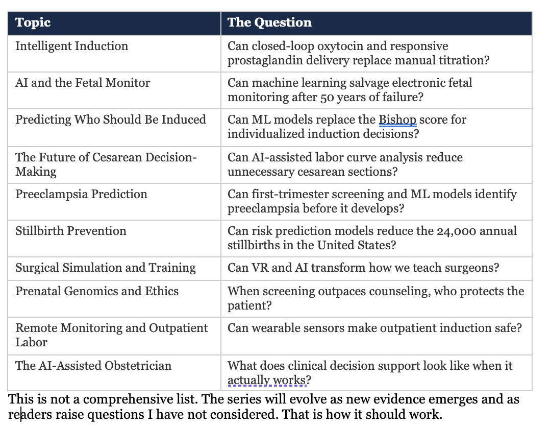 What I bring to this series is some technology expertise. It is mostly clinical judgment: the ability to look at a new technology, a new algorithm, a new device, and ask the questions that matter. Does this solve a real clinical problem? Is the evidence sufficient? Who benefits? Who is at risk? What are we not being told? And the hardest question of all: is the profession’s resistance to this innovation based on legitimate caution, or on the same inertia that kept us shaving pubic hair and cutting episiotomies for 50 years?
