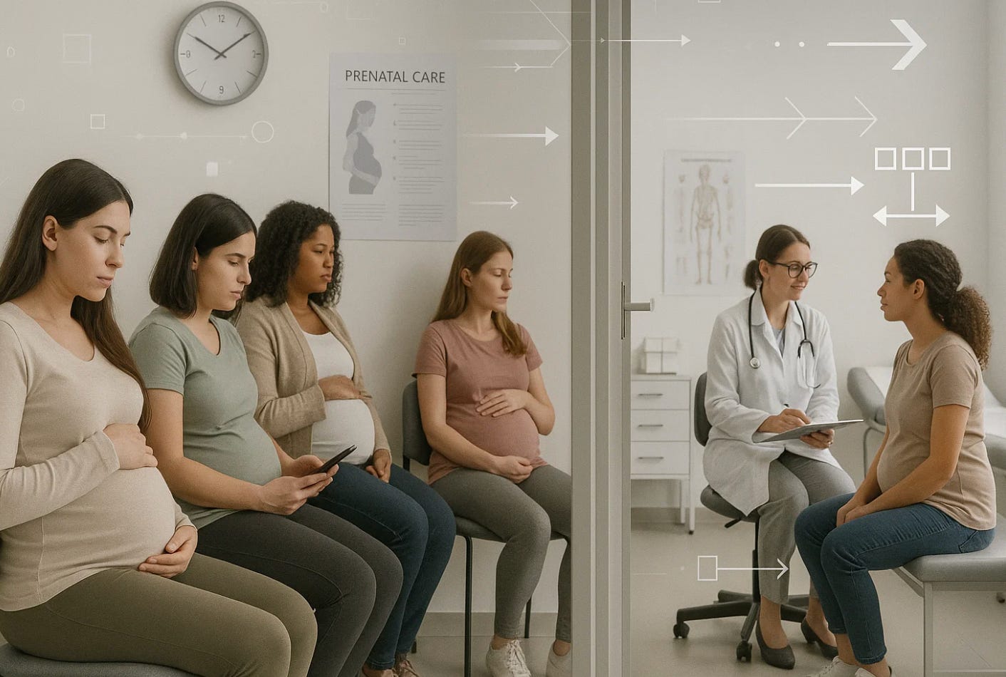 The core of a prenatal visit is simple. Evaluate maternal well being. Evaluate fetal well being. Identify complications early. Counsel about expected changes. Plan follow up. Yet most visits barely accomplish this. Women describe feeling rushed, unheard, and hurried out the door. Clinicians describe being overscheduled, understaffed, and forced to rely on shortcuts because the system leaves them no time to think. Prenatal care should be anticipatory. Instead it is often reactive.