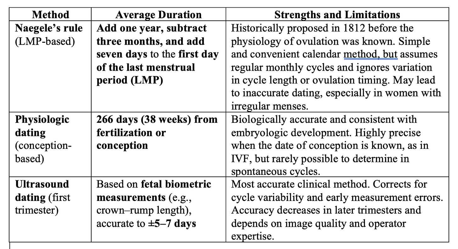For this reason, modern obstetrics often prefers to use a combination of first-trimester ultrasound dating and the physiologic benchmark of 266 days from ovulation/fertilization, which aligns better with embryologic development. Naegele’s rule remains a convenient heuristic, but it should be corrected or refined with more accurate methods when possible, as precision in gestational dating has significant implications for clinical care, decision-making, and outcomes.