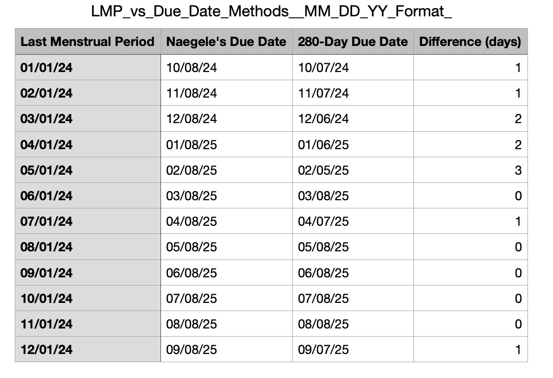 The above table shows that there are differences in Naegele’s due date calculation and the 280-day calculation. The differences are between 0 and 3 days.
