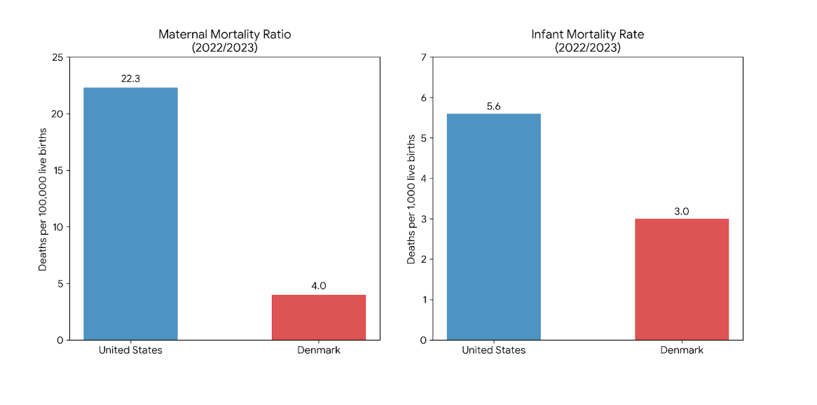 Denmark’s maternal mortality rate is about 4 deaths per 100,000 live births. Ours is over 22 per 100,000. More than five times higher than Denmark’s. For Black women in America, it’s closer to 50 or over 12-times the rate in Denmark..