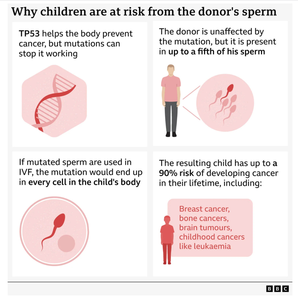 The underlying diagnosis was Li-Fraumeni syndrome, caused by a pathogenic mutation in the TP53 tumor suppressor gene. This condition carries an exceptionally high lifetime risk of cancer, often beginning in childhood and involving multiple organs. What made this case especially troubling is that the donor himself was healthy. He passed all required screening at the time of donation. The mutation was present only in a portion of his sperm due to germline mosaicism, a biological phenomenon that routine testing could not detect then and often cannot detect even now.