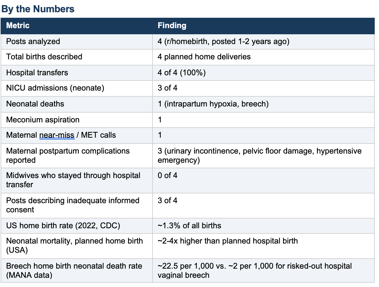 Four Reddit posts from r/homebirth -- posted within the last 1-2 years -- describe what happened when planned home deliveries went wrong. You never get that information from midwives.