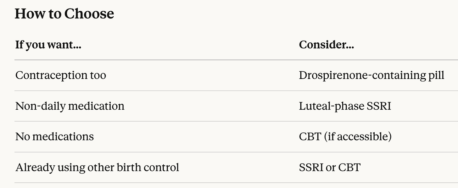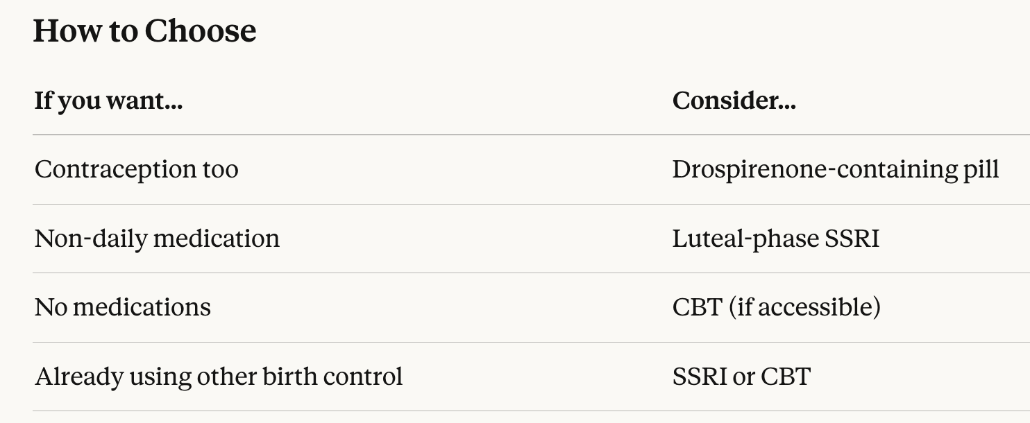 Birth control pills containing drospirenone (brand names include Yaz and Beyaz) are the only oral contraceptives FDA-approved for PMDD. In trials, 48% of women responded to treatment versus 36% on placebo. The number needed to treat is 8, meaning for every 8 women who try it, one will benefit who wouldn’t have improved on placebo.