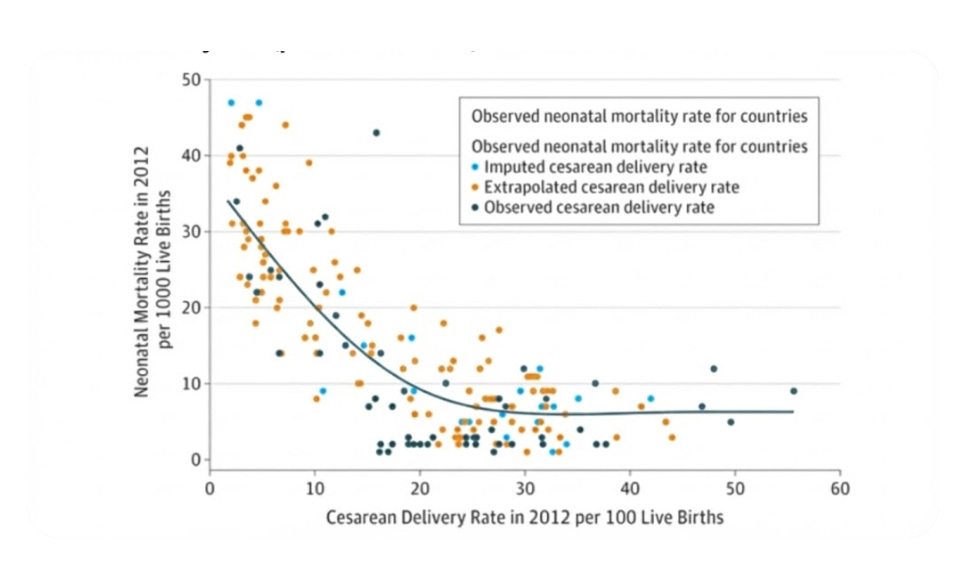 This graph above is from a JAMA study showing that optimal neonatal mortality is reached around a 30% cesarean delivery rate. The rate we presently see in the US.