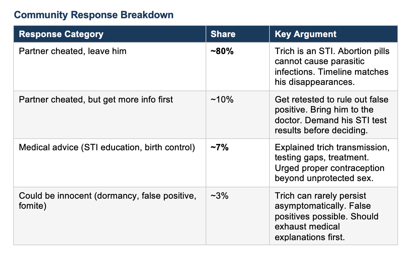 This case is a useful teaching moment. Abortion pills, specifically mifepristone and misoprostol, work by blocking progesterone and causing uterine contractions. They do not introduce organisms into the body. They cannot cause a parasitic infection. When someone who has only one sexual partner tests negative for trich repeatedly and then suddenly tests positive, the medical explanation is straightforward: their partner had sexual contact with someone else. Several healthcare professionals commented on the thread, including a Planned Parenthood worker and a physician assistant in family medicine, all confirming the same conclusion. The timeline in this case also fits: the fiance’s two unexplained disappearances in late December and mid-January align perfectly with the typical trich incubation period before her positive test on February 9.